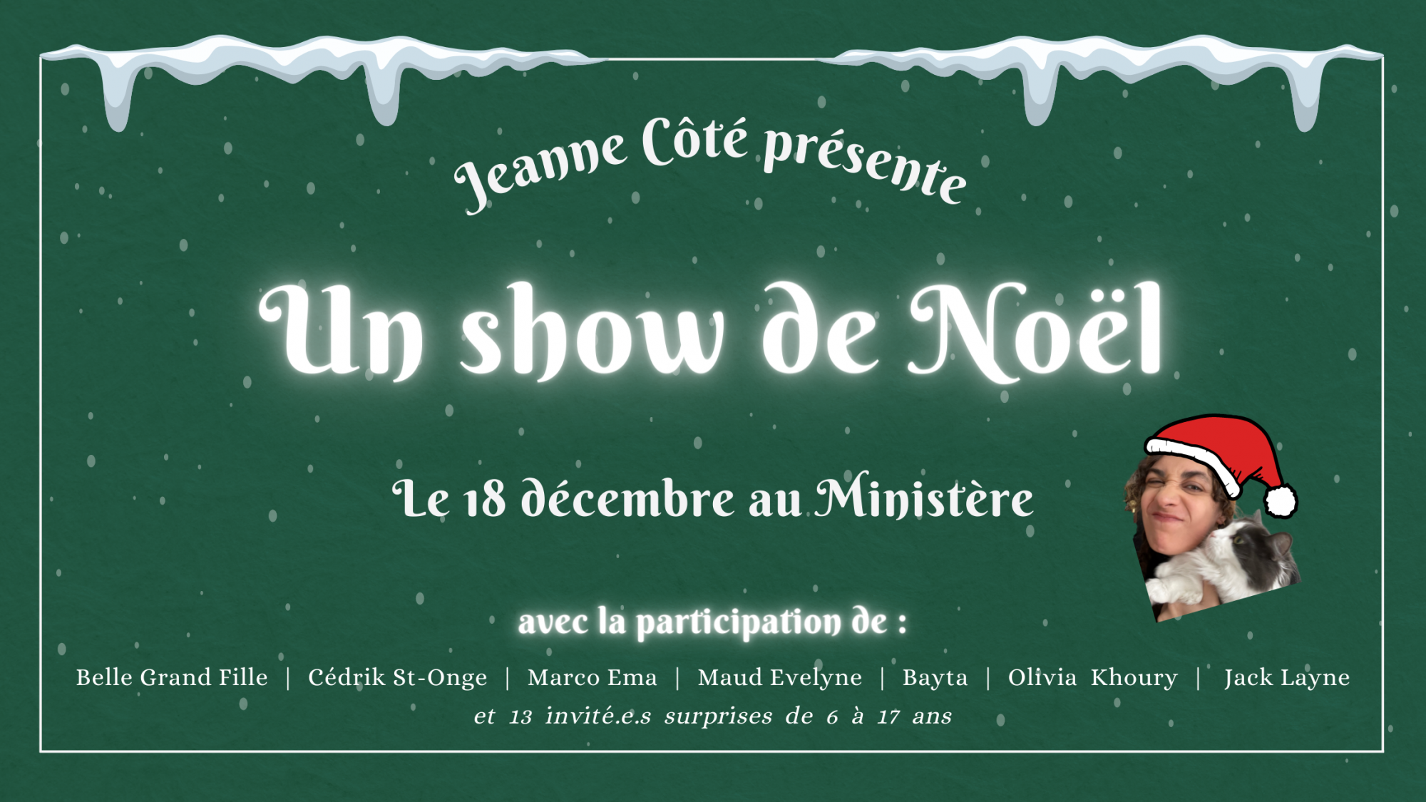 Jeanne Côté profite de l’effervescence du temps des Fêtes pour rassembler des ami.e.s artistes et ses jeunes recrues autour du répertoire de Noël. Dans un festif et lumineux mélange de chansons de toutes les époques, qu’elles soient emballées dans un vieux sac de jute ou du papier brillant, ce spectacle sera une occasion de se rassembler sans compétition, sans flafla, juste pour le plaisir de faire de la musique ensemble. Avec : Belle Grand Fille, Marco Ema, Cédrik St-Onge, Jack Layne, Olivia Khoury, Bayta, Maud Evelyne, et 13 invité.e.s surprises de 6 à 17 ans.
