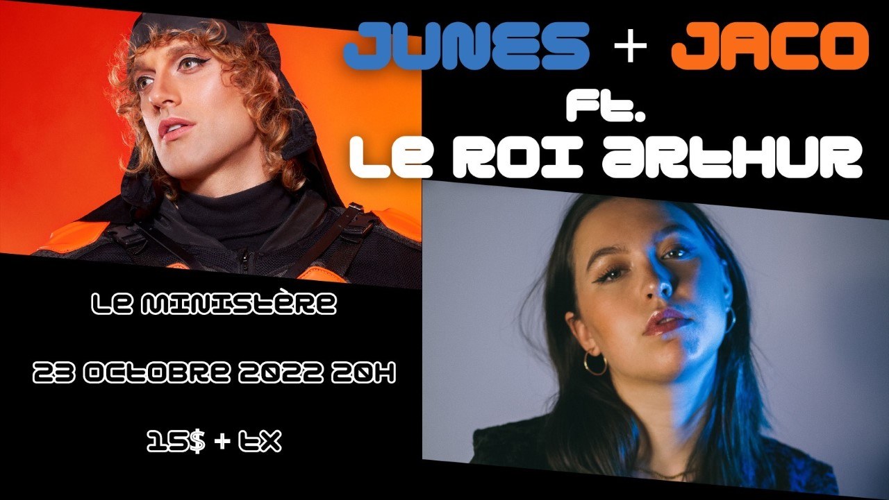 Junes et JACO, c'est un mélange de groove et d'explosion. Armé·e·s de leurs chansons entraînantes et accrocheuses, ces deux artistes de la relève franco-montréalaise sauront vous faire bouger ! Ami·e·s avant d'être collaborateur·trice·s, iels vous feront part de leur chimie et vous offrirons le plus beau des partys. Vous aurez même la chance d'y apercevoir le plus cool de la fête, celui qui fait tourner toutes les têtes : leur réalisateur, Arthur Bourdon-Durocher, aussi appelé Le Roi Arthur.