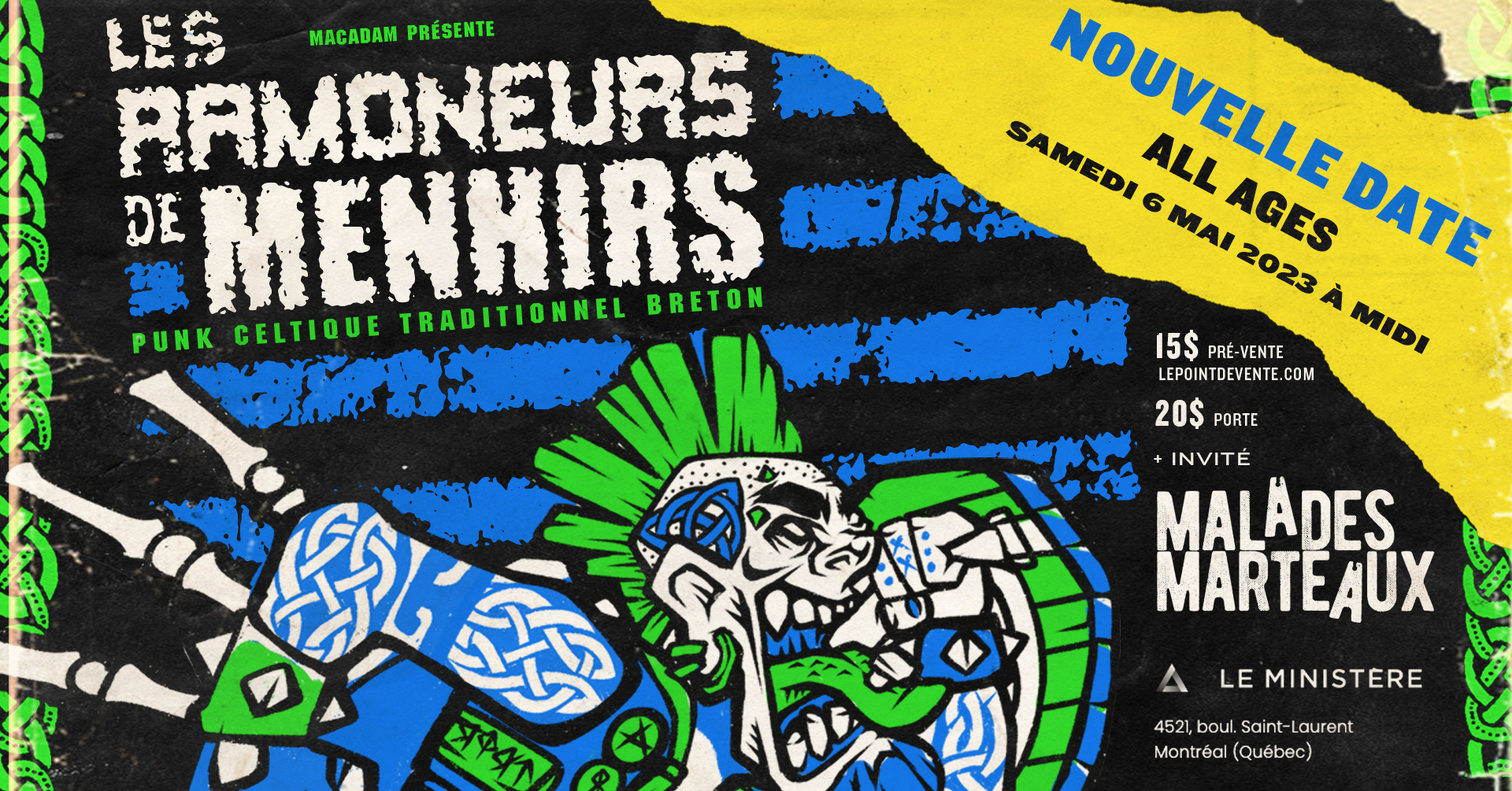 Les Ramoneurs de Menhirs + Les Malades Marteaux Punk Show punk rock franco All Ages avec Les Ramoneurs de Menhirs (Ex-Bérurier Noir) et Les Malades Marteaux. Genre Punk Public Général Dates de représentation samedi 06 mai 2023 Ouverture des portes 12H00 Début de l'évenement 12H30 Achats de billets Admission générale À partir de 20,06 $ Acheter vos billets Tous les prix sont en dollar canadien et comprennent les taxes.