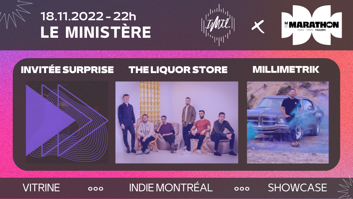 En partenariat avec M pour Montréal, dans le cadre de la série MARATHON, Indie Montréal [IMTL Agence] vous offre une soirée de pur fun et vous présente trois artistes de son roaster : The Liquor Store, Millimetrik et une troisième invitée surprise qui sera annoncée prochainement.